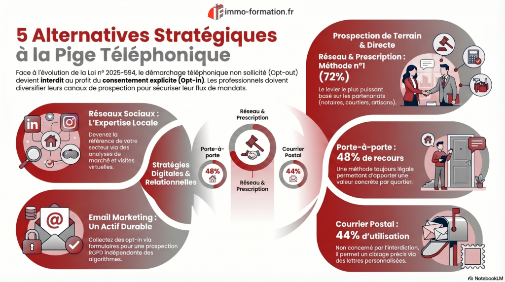 ✅ En résumé : Les méthodes non électroniques (courrier postal, porte-à-porte, événements locaux) conservent leur cadre légal actuel. C’est le démarchage téléphonique et électronique à froid qui disparaît. Il faut désormais construire un écosystème de prospection multicanal.